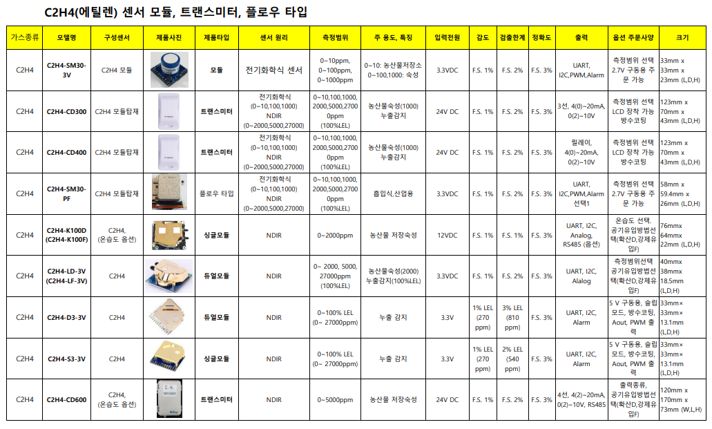 [ELT SENSOR 제품 요약 표] C2H4(에틸렌) 센서 모듈, 트랜스미터, 플로우 타입